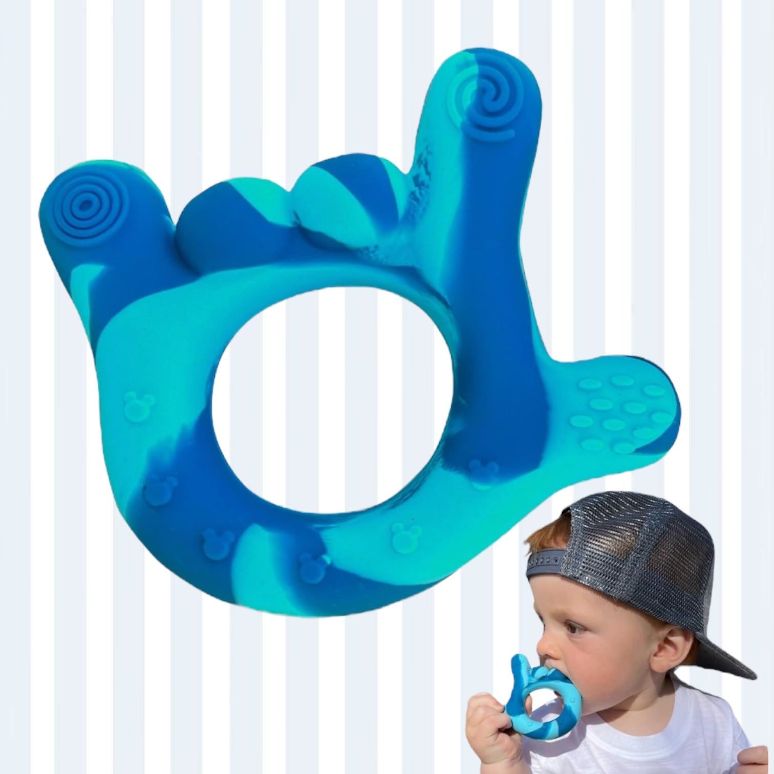 - π€ ππ’π π§ π¨π ππ¨π―π π’π§ πππ ππ§π πππ₯π¦π’π§π πππ¬π’π π§: Our teether is shaped like a chubby baby hand with fingers forming the "I love you" sign in sign language, creating a meaningful and adorable connection for your little one. Teaching your little one Baby Signs? This is perfect! Designed to mimic the ends of mom's fingers and short enough to be gag proof. This teether is thoughtfully designed to be easily grasped by small hands, promoting fine motor skills development for your growing baby. The color is soft and calming, just what is needed when a baby is teething.